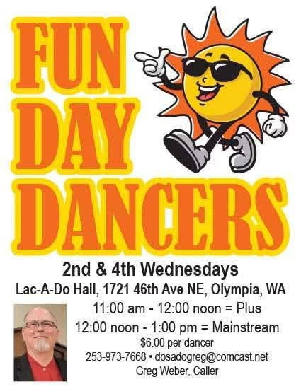 Fun Day Dancers is a Mainstream and Plus club that dances during the day, so dancers don’t have to drive at night. We have two dance schedules and venues. On first and third Tuesdays FDD dances at the Sumner VFW Hall in Sumner. On second and fourth Wednesdays we dance at Lac-A-Do Hall in Olympia. At each dance we dance Plus from 11:00 am to 12:00 noon and then we dance Mainstream from 12:00 noon to 1:00 pm. Greg Weber is the caller. For more details find us on Facebook by Clicking here.